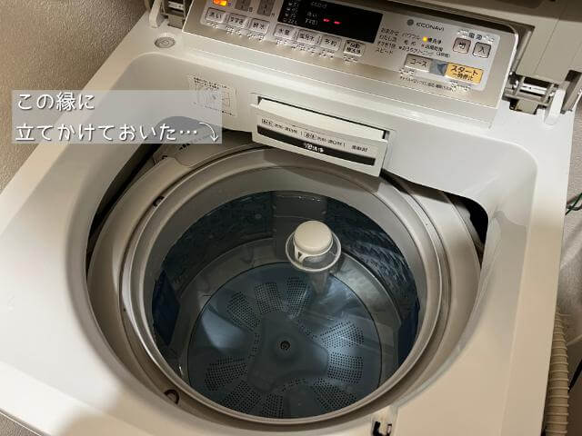 すごいアホな話なんですが、空になったシャンプーボトルを洗って、パーツを分解して、水気を乾かすため洗濯槽の縁に立てかけておいたんです…。